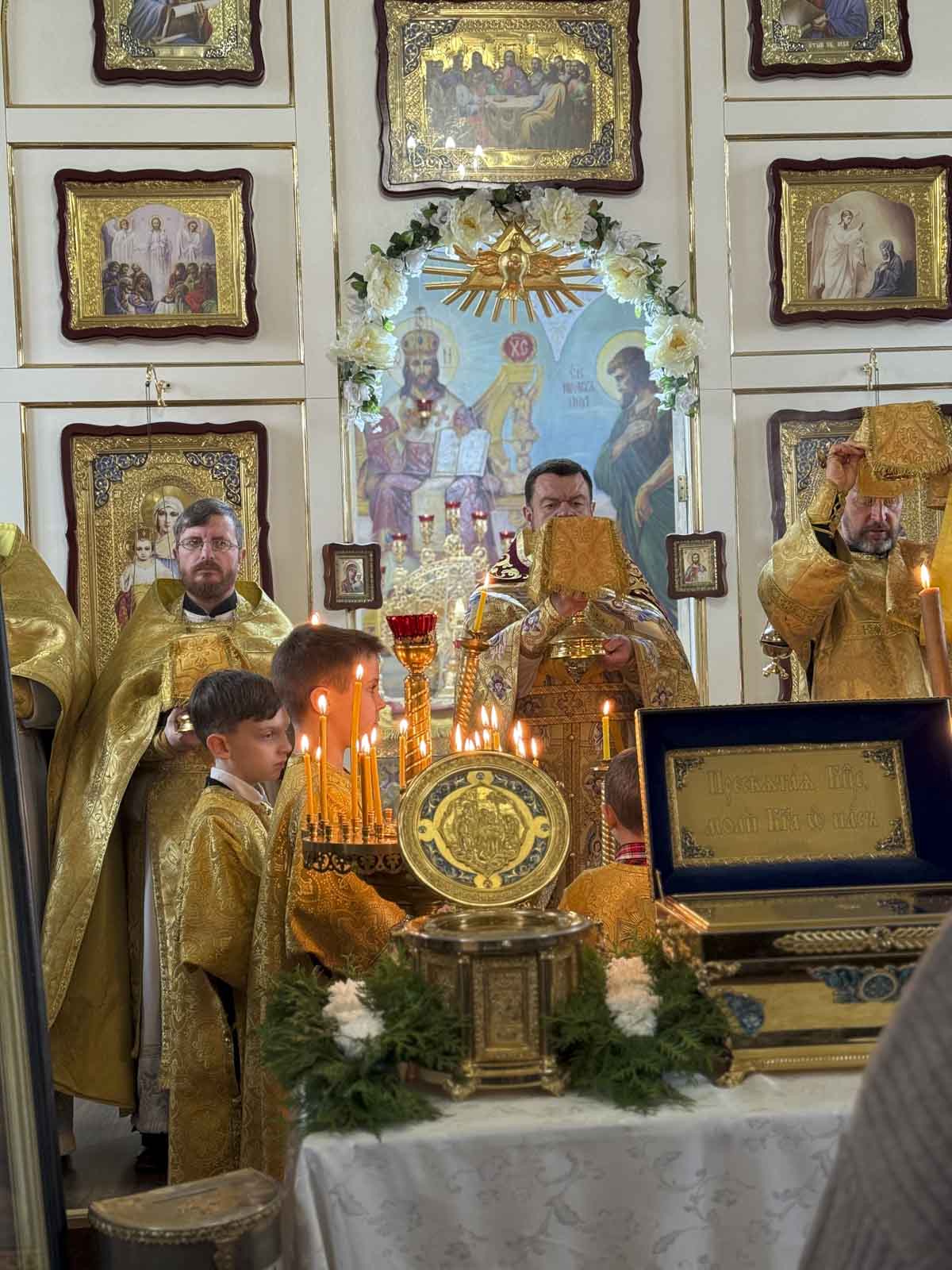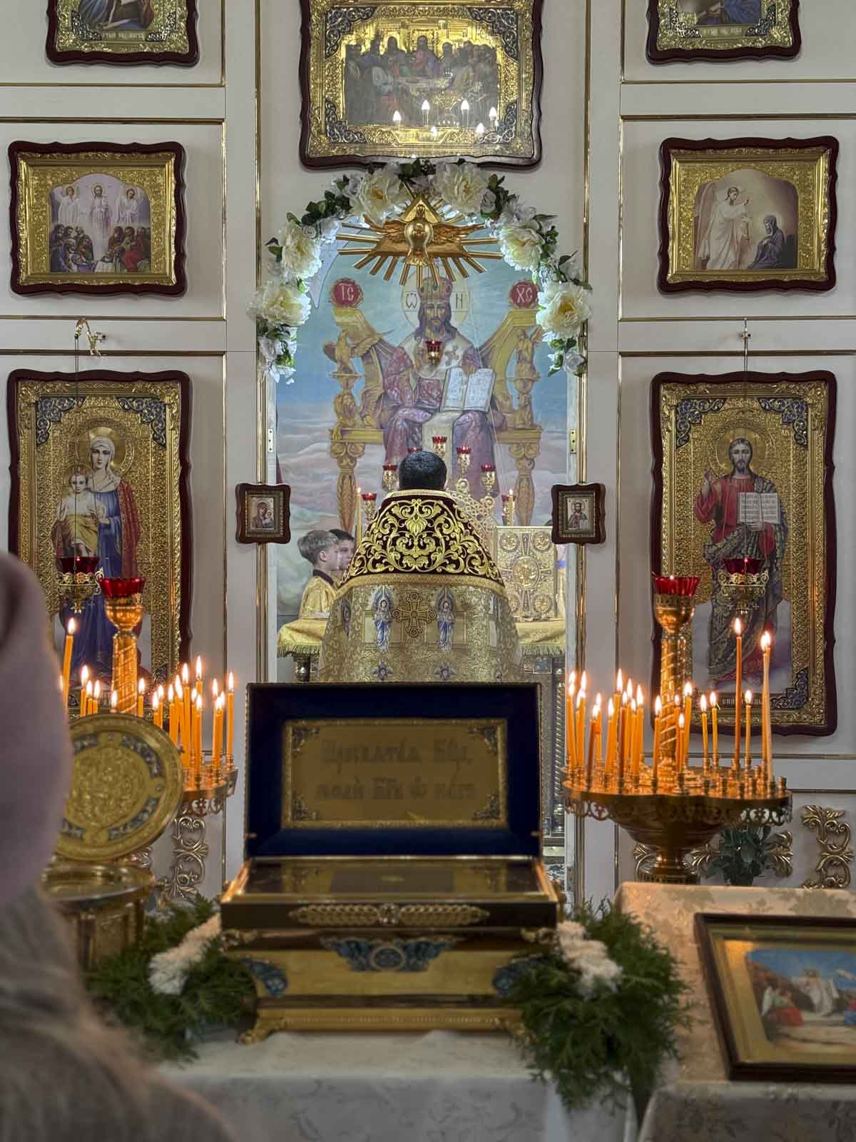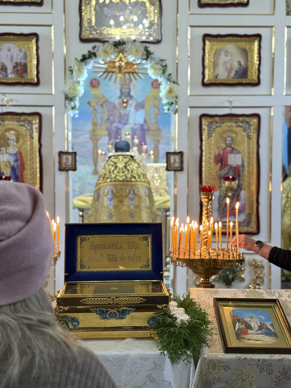 Эти дни для храма особенные — здесь пребывают великие святыни: ковчег с частицей мощей святой блаженной Матроны Московской и ковчег с частицей ризы Пресвятой Богородицы. Множество прихожан пришло вознести молитвы перед святынями, поблагодарить Господа и попросить Его благословения.