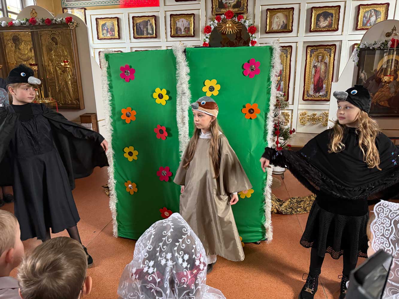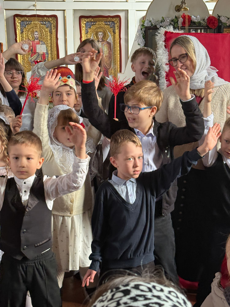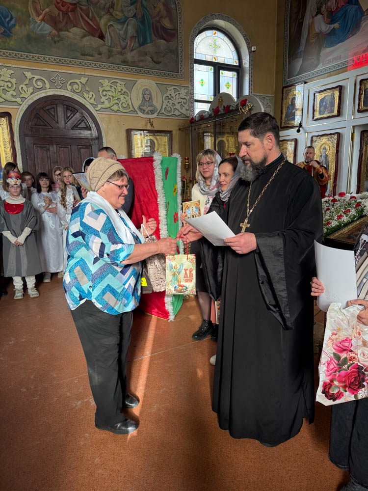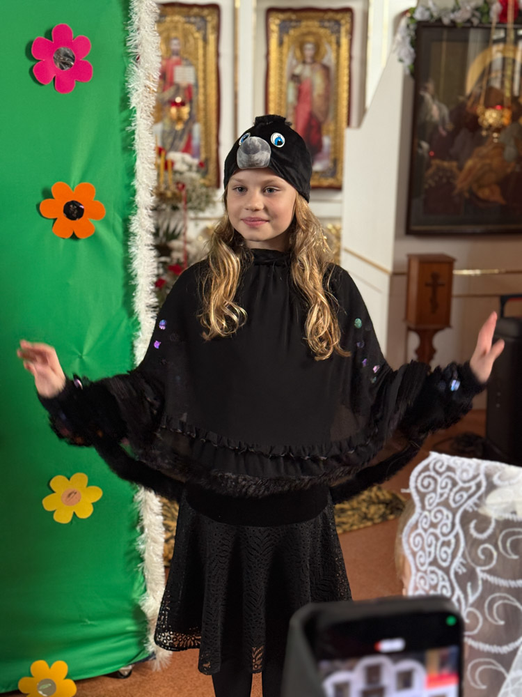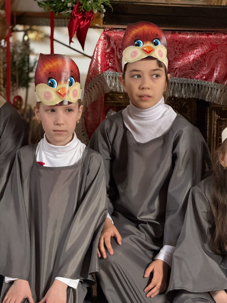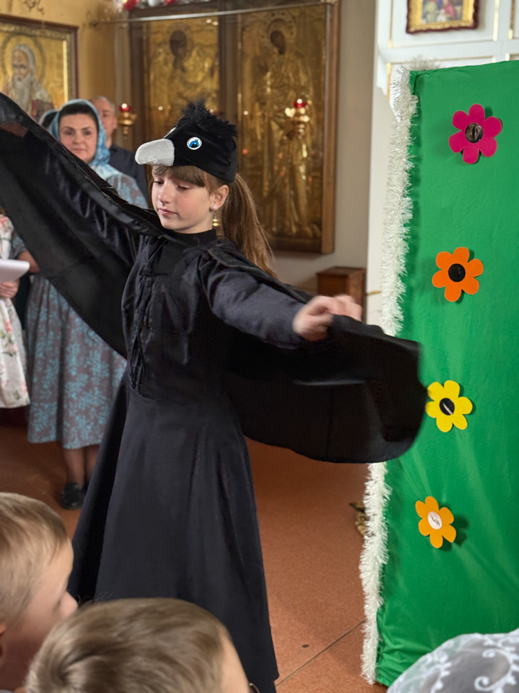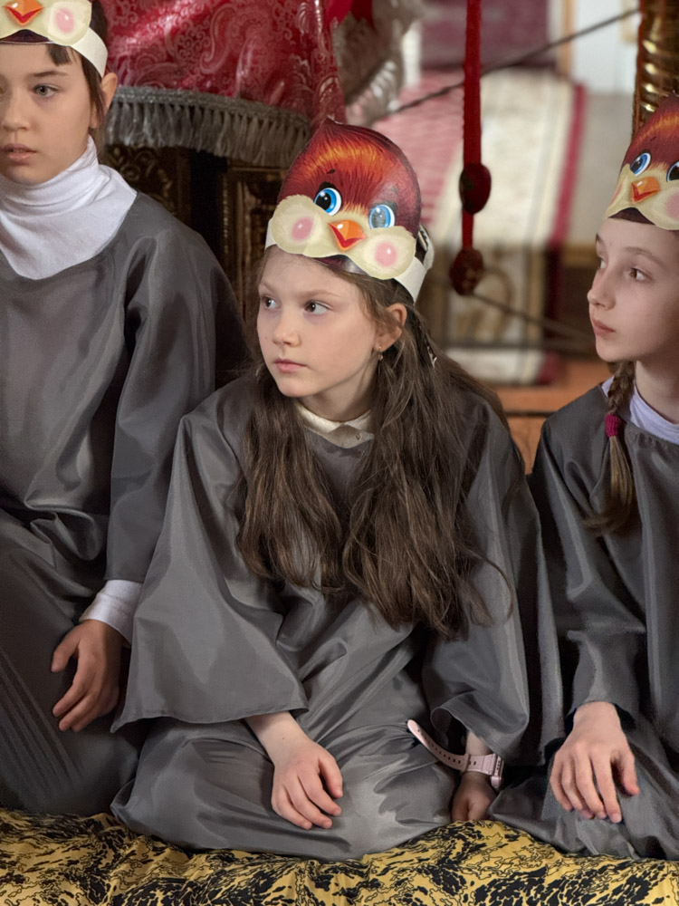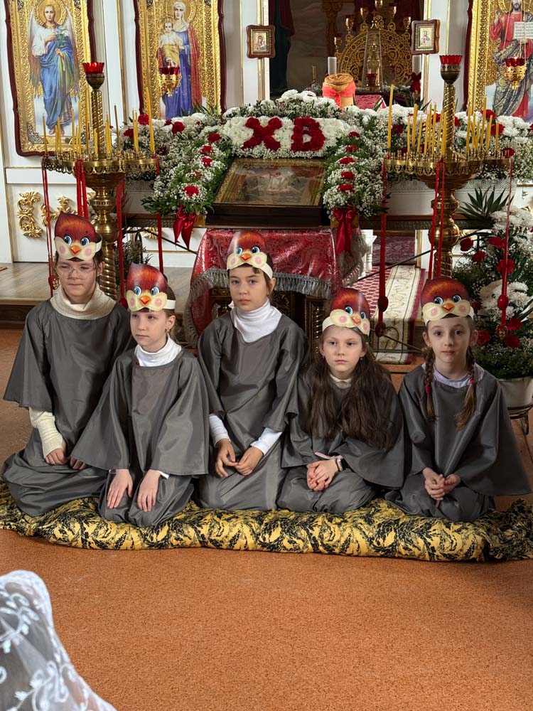 Дети поздравили приход с Пасхой стихами, песнопениями и добрыми словами о Воскресшем Христе. Юные артисты подготовили сказку о красношейке – маленькой птице, получившей свои красные пёрышки за помощь и сострадание.