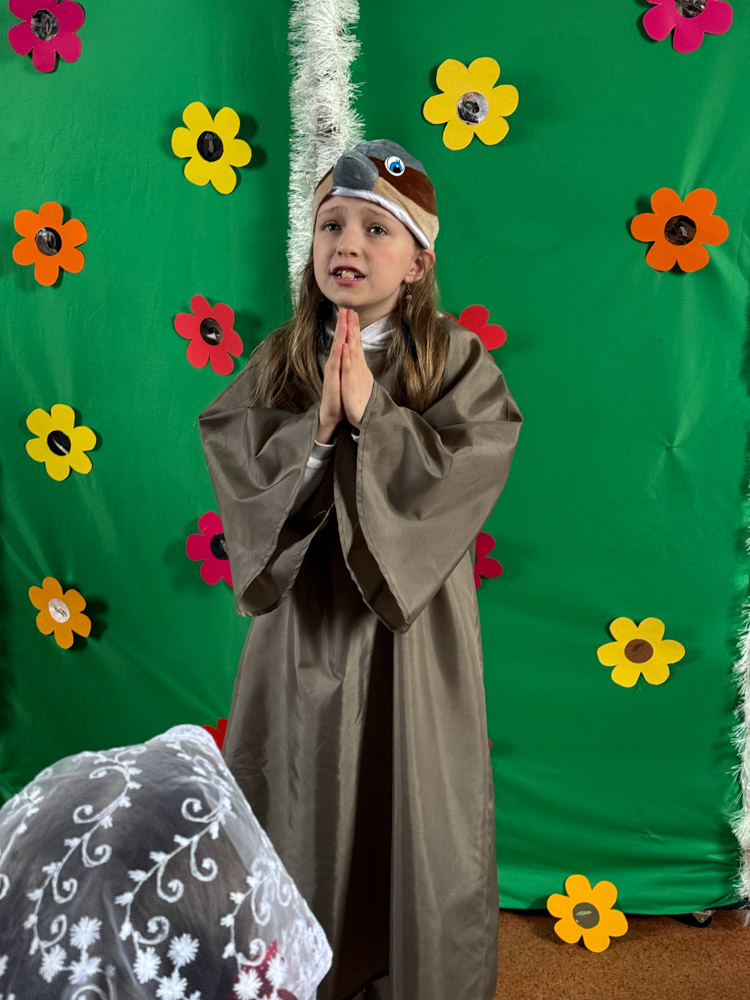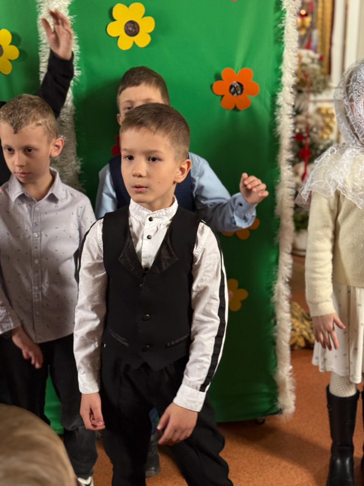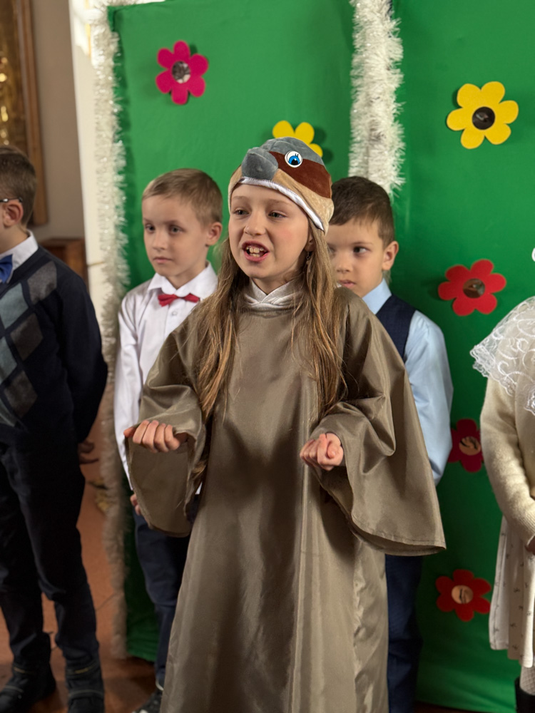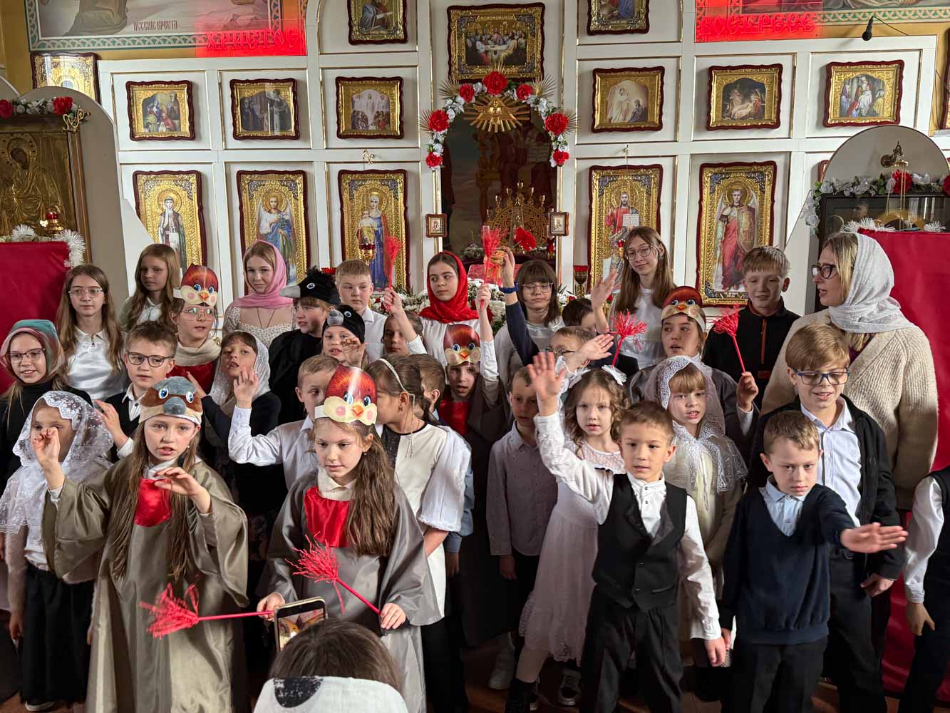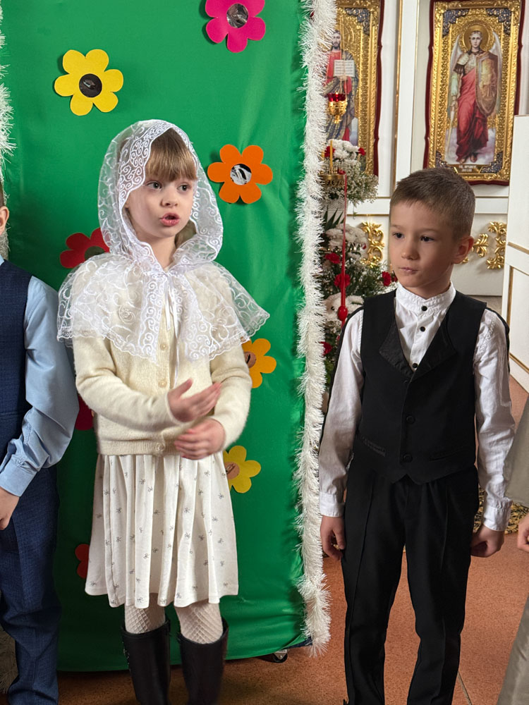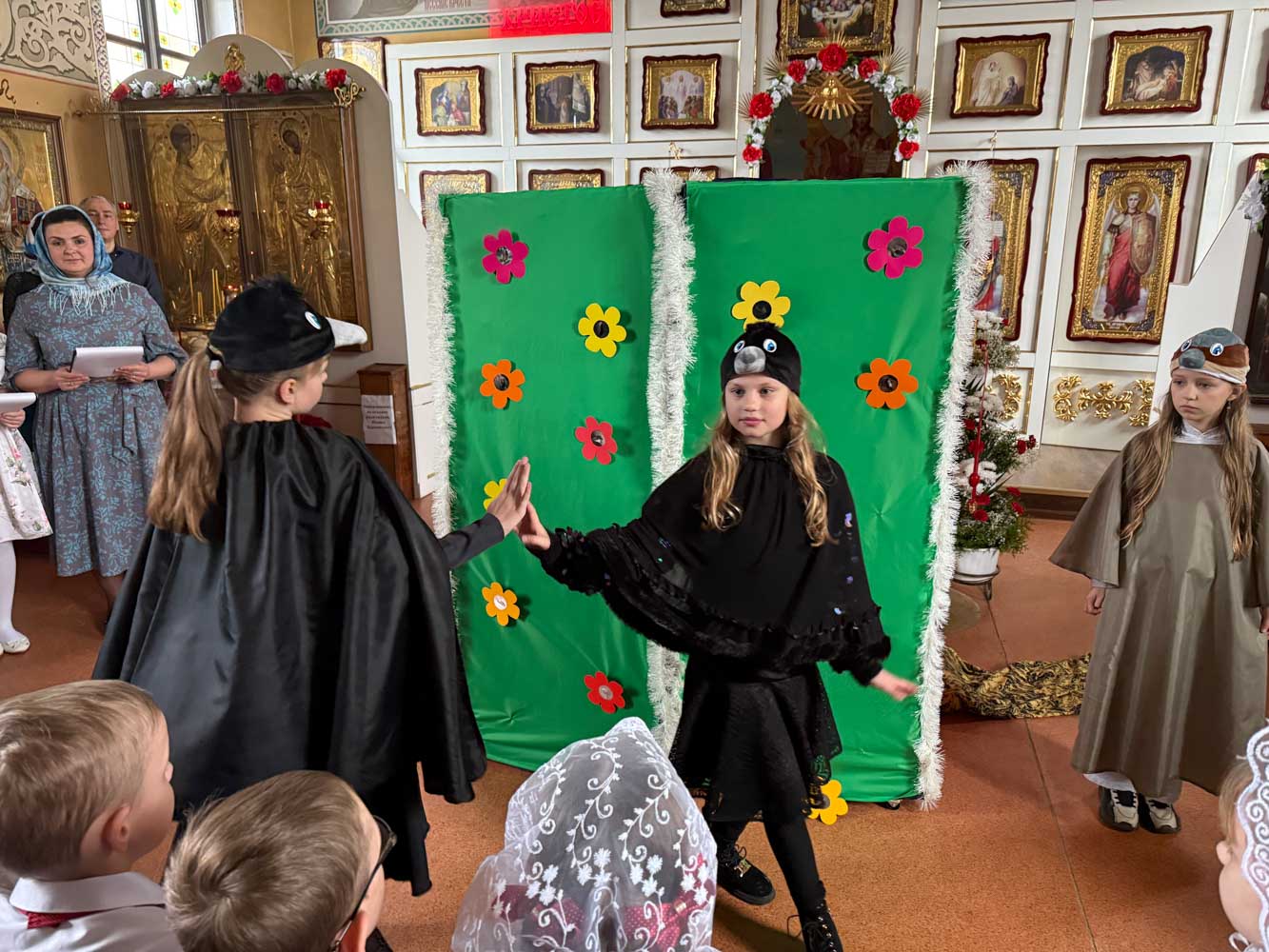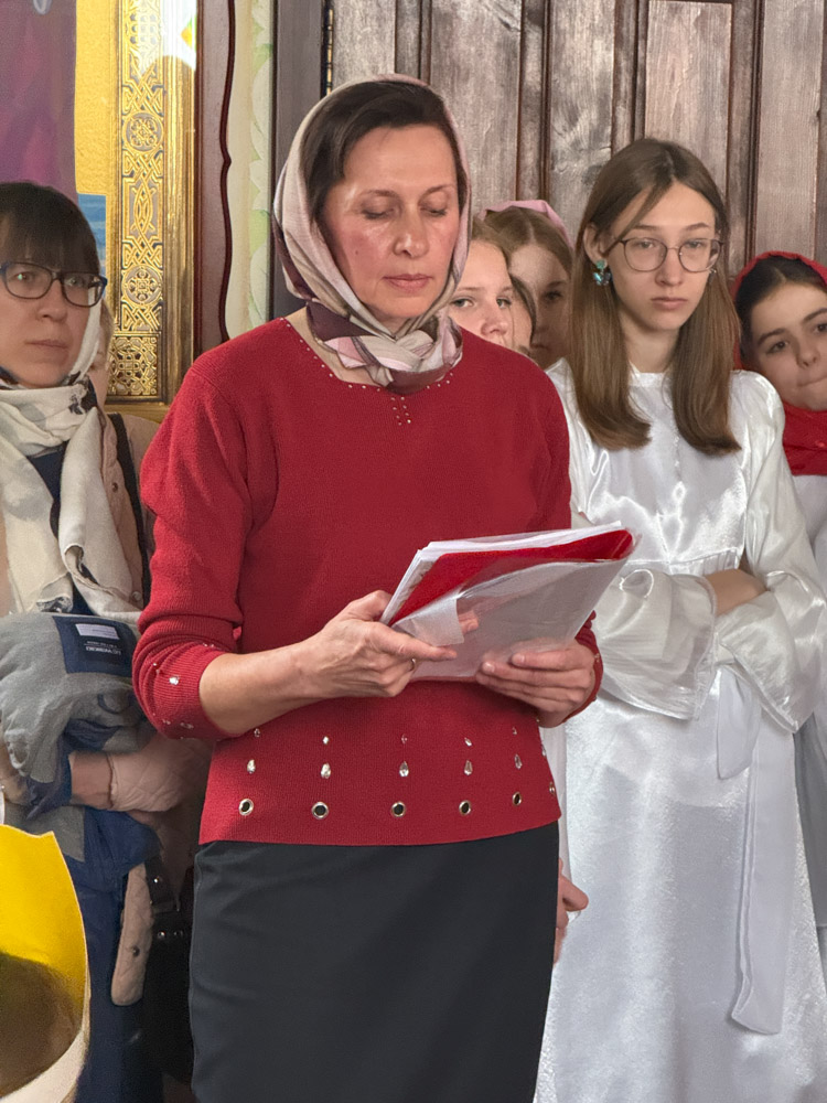 Дети поздравили приход с Пасхой стихами, песнопениями и добрыми словами о Воскресшем Христе. Юные артисты подготовили сказку о красношейке – маленькой птице, получившей свои красные пёрышки за помощь и сострадание.
