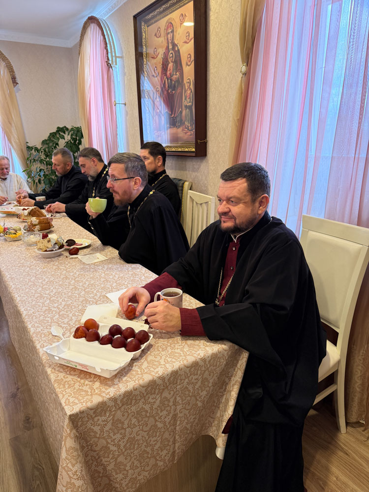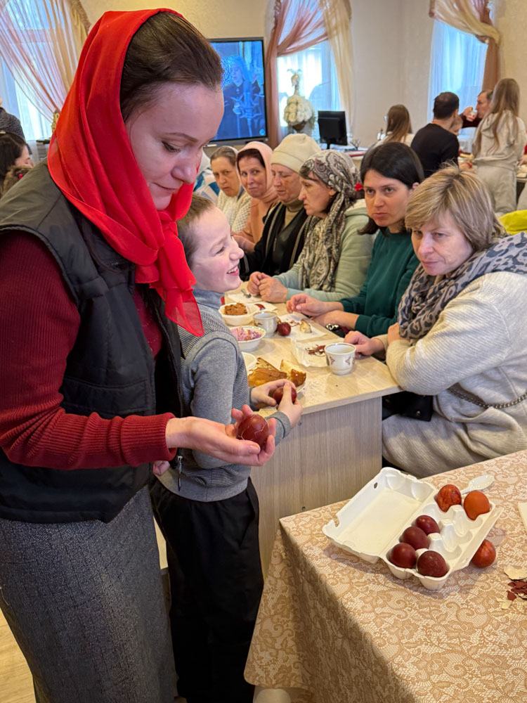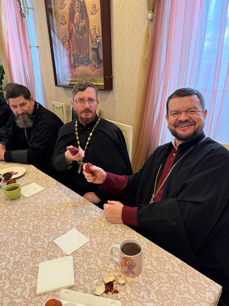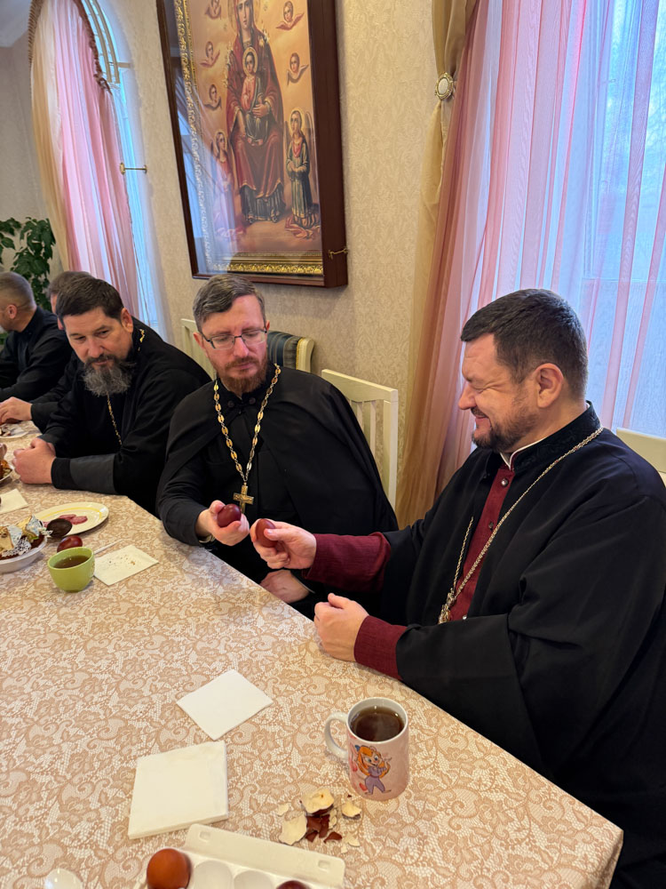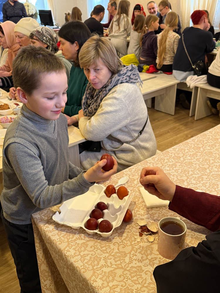 Продолжился день общей пасхальной трапезой в конференц-зале. За одним столом собралась приходская семья: разговаривали, делились радостью праздника, угощали друг друга куличами, играли в битки. Именно в такие минуты особенно ясно чувствуется, что Пасха живёт не только в церковном песнопении и торжестве богослужения, но и в самом строе приходской жизни — в единстве, общении и общей радости.