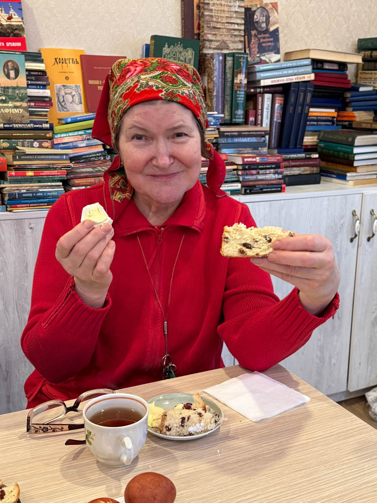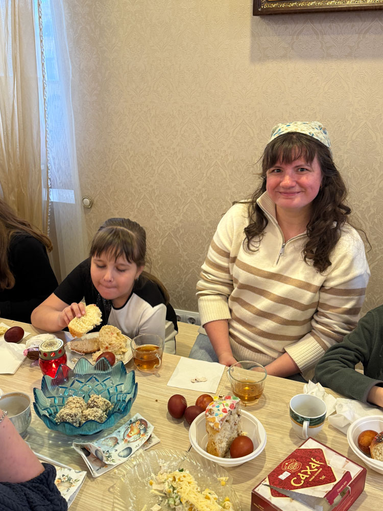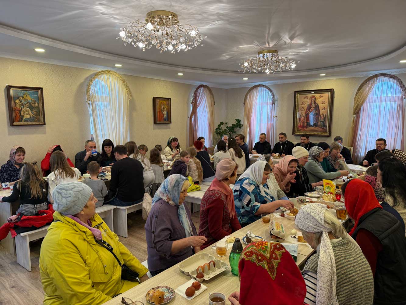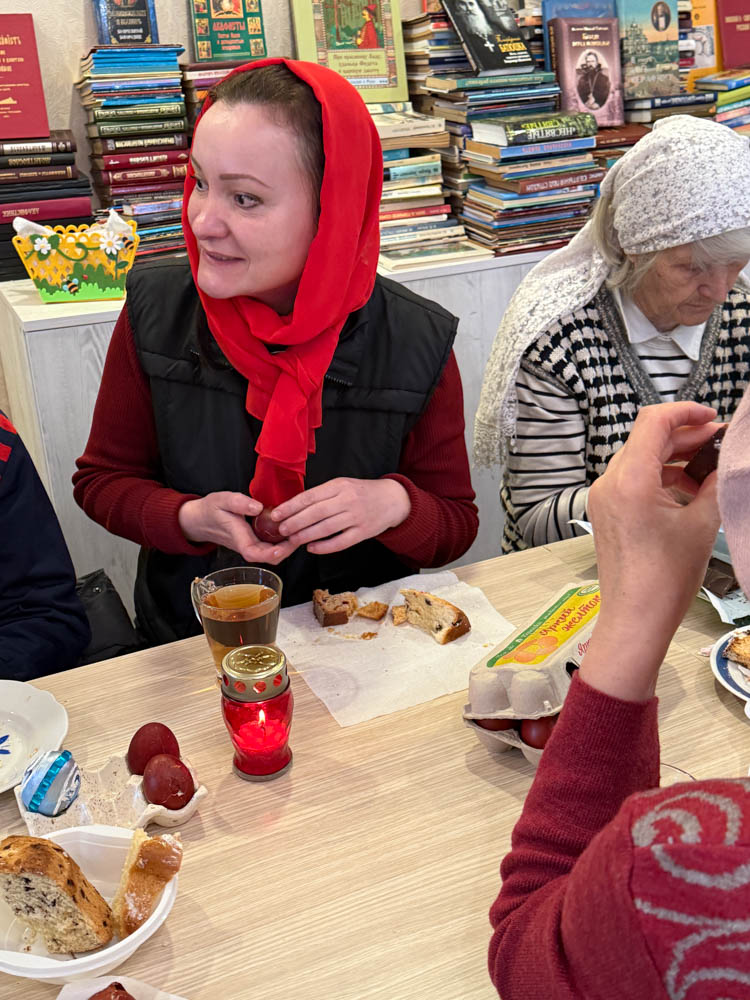 Продолжился день общей пасхальной трапезой в конференц-зале. За одним столом собралась приходская семья: разговаривали, делились радостью праздника, угощали друг друга куличами, играли в битки. Именно в такие минуты особенно ясно чувствуется, что Пасха живёт не только в церковном песнопении и торжестве богослужения, но и в самом строе приходской жизни — в единстве, общении и общей радости.