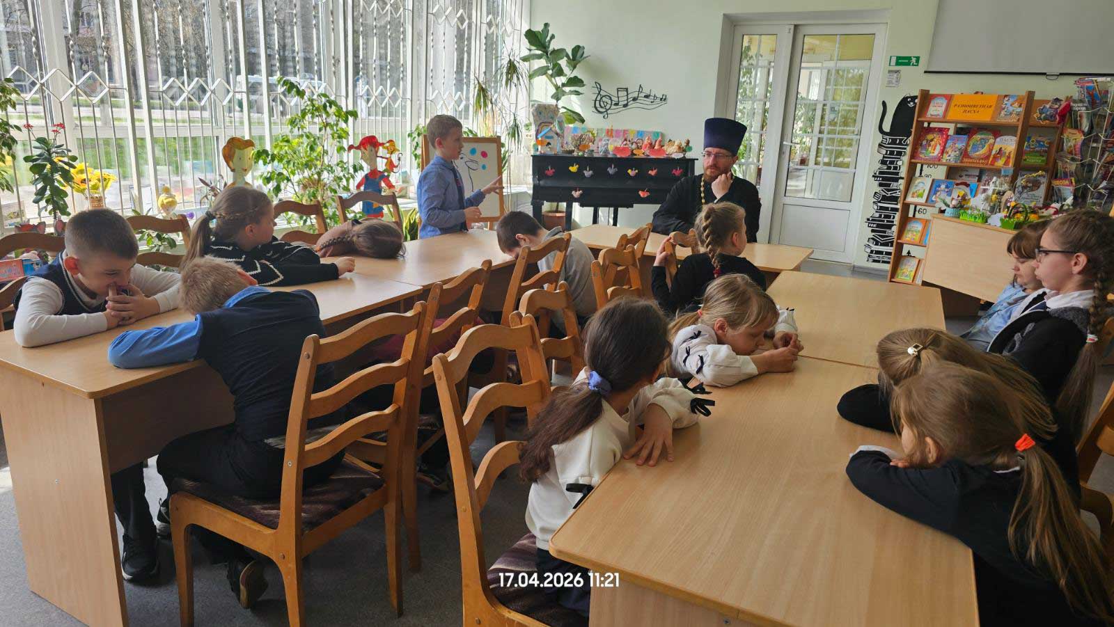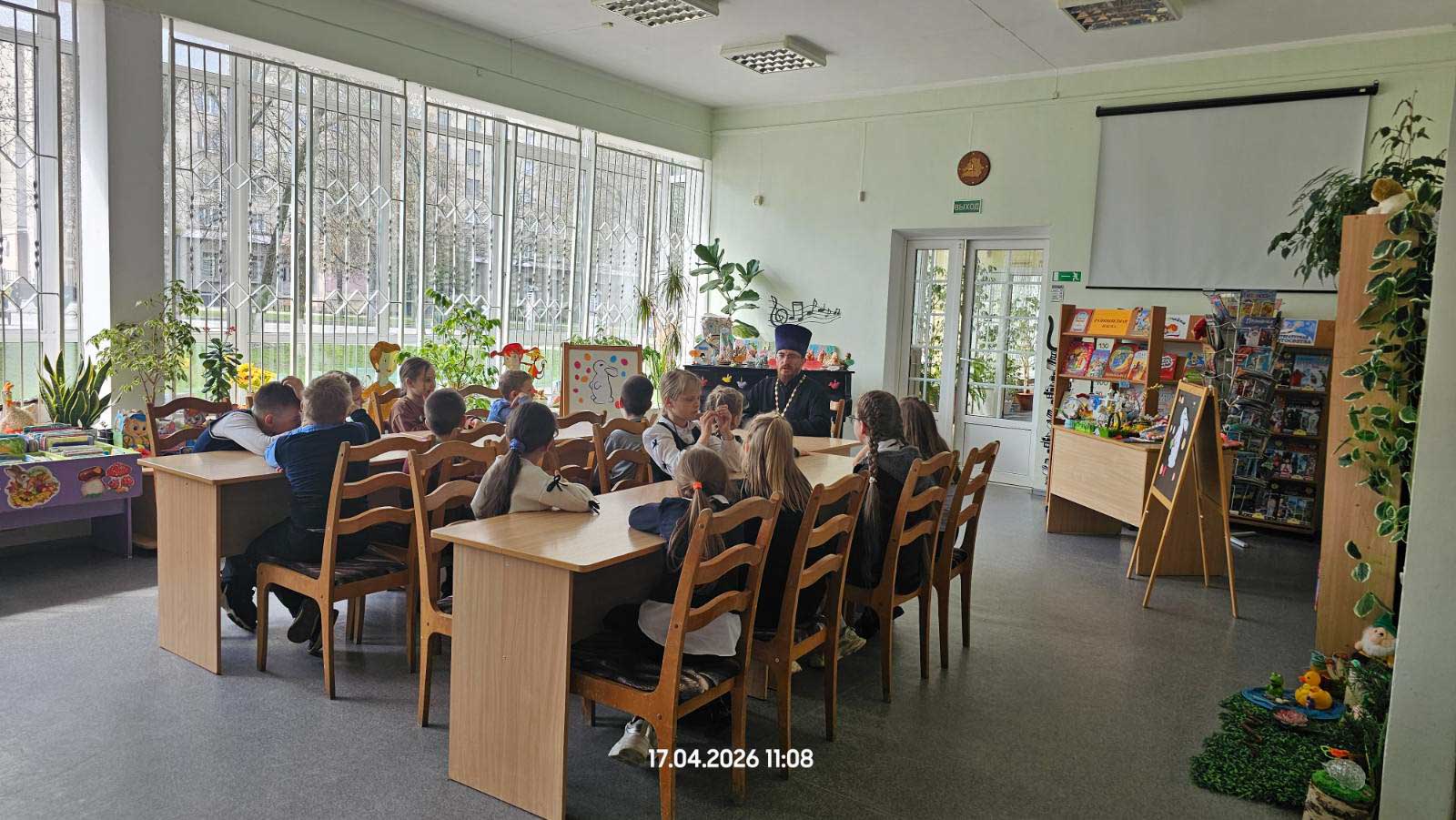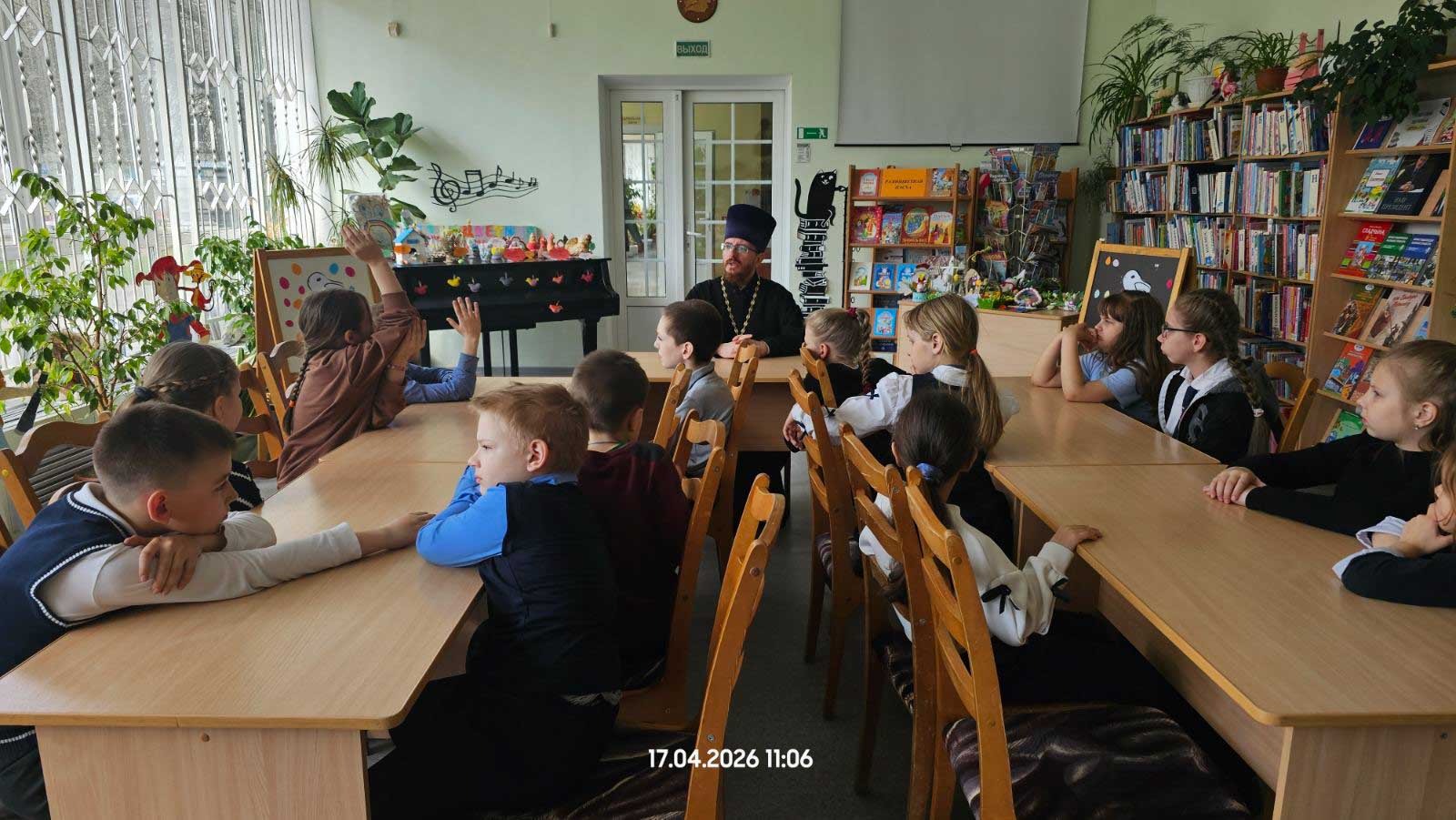 17 апреля 2026 года в библиотеке-филиале № 1 имени И. П. Мележа в рамках цикла пасхальных мероприятий состоялась встреча школьников со священнослужителем. Участниками беседы стали учащиеся младших классов средней школы № 29 г. Гомеля.