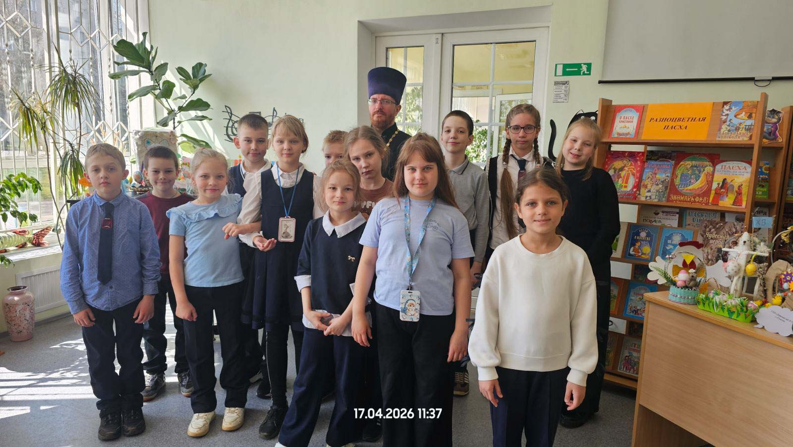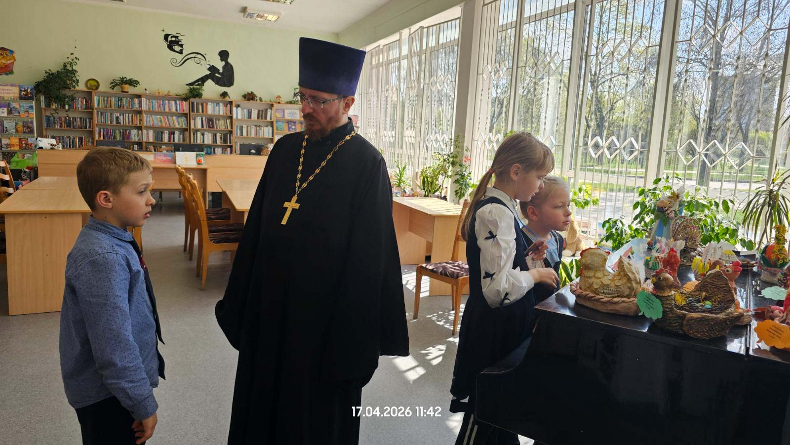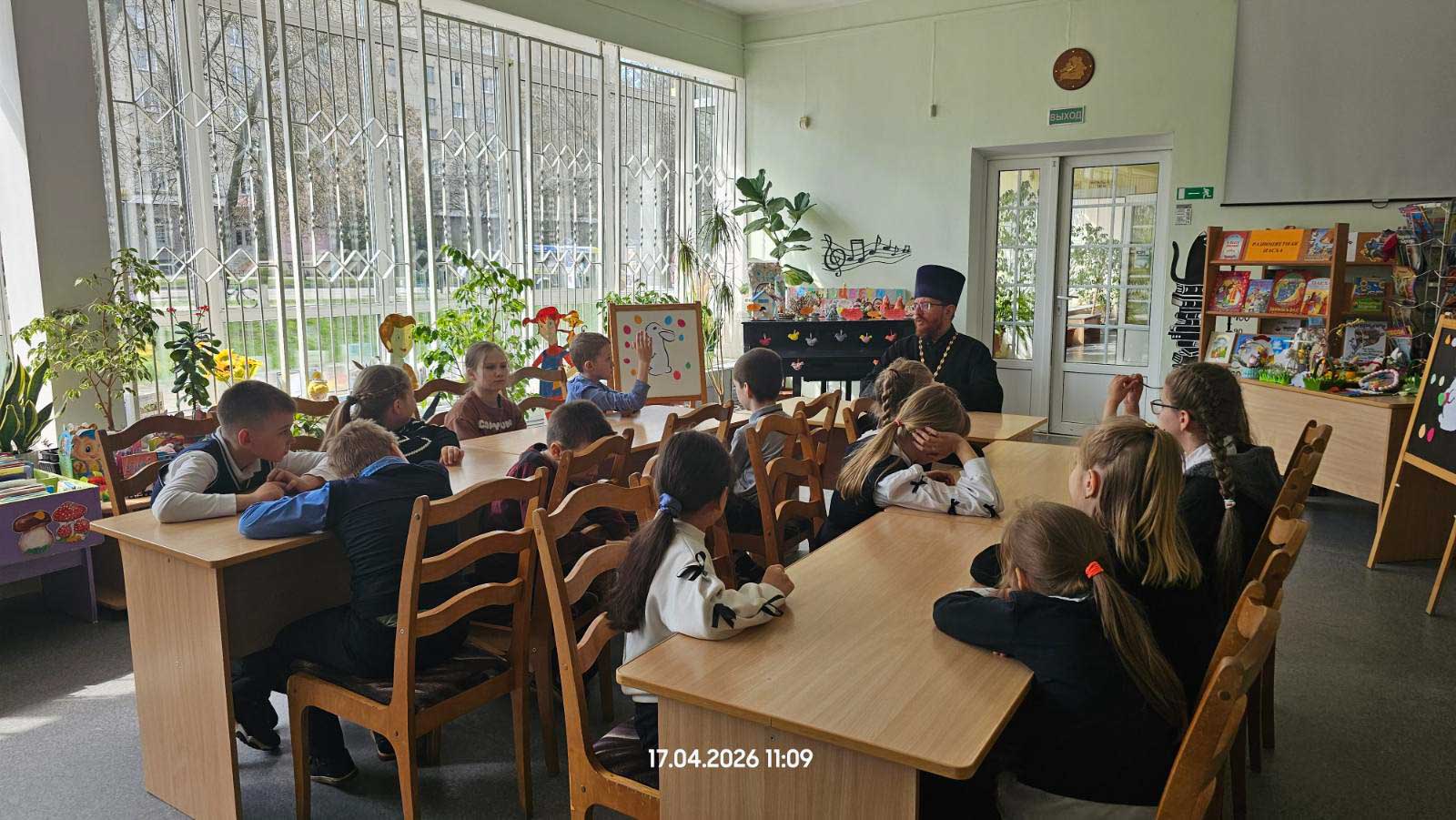 17 апреля 2026 года в библиотеке-филиале № 1 имени И. П. Мележа в рамках цикла пасхальных мероприятий состоялась встреча школьников со священнослужителем. Участниками беседы стали учащиеся младших классов средней школы № 29 г. Гомеля.
